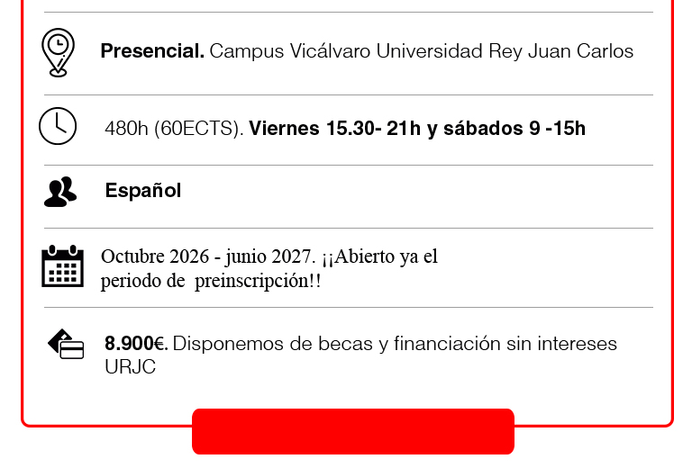 Si quieres recibir información sobre todas ellas, no dudes en ponerte en contacto con nosotros a través del correo electrónico : titulopropio.mastersap@urjc.es o en los teléfonos +34 669 791 656 // +34 699 808 743